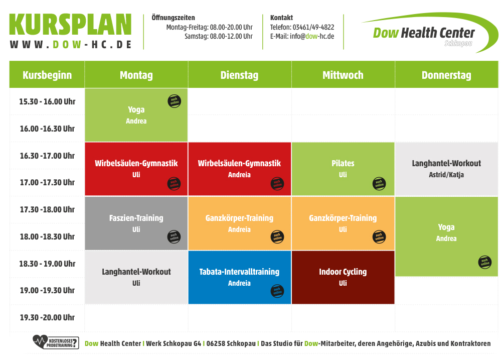 Unser Kursplan: Bei allen Kursen mit dem Stempel „auch online“ ist die Teilnahme auch ONLINE möglich (alle außer Langhantel und IC)
